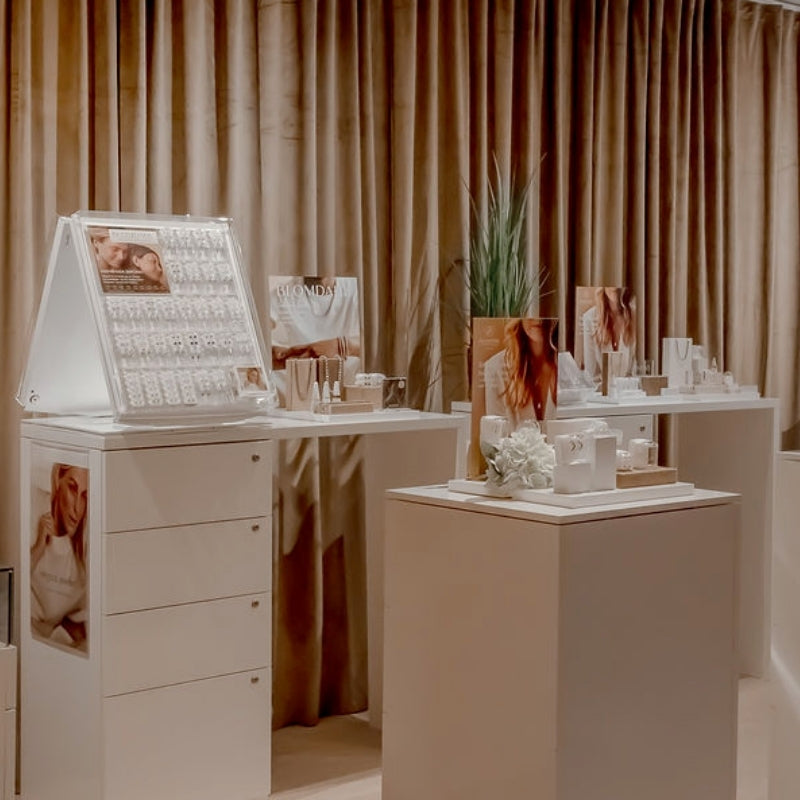 Showcase your piercing services and Blomdahl jewellery with our specially designed in-store displays. Perfect for partner stores, our displays highlight the quality, safety, and style of Blomdahl products, attracting attention and helping customers explore our piercing and jewellery range with ease.